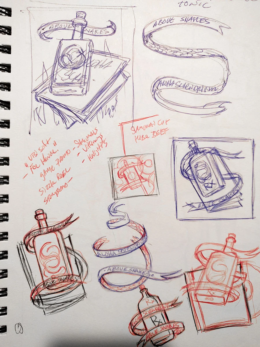 I made some album artwork recently for the sci-fi-surf-rock band Aloha Screwdriver. Their new EP is called "Above Snakes" and they were open to any interpretation of that. There's an undertone of western grit on this record and I thought maybe a traveling snake oil salesman theme might work. Then, for some reason, I got the idea that it should be in three dee. In the end, the band shipped the blue vinyl 7" record with red/blue glasses (the term for red/blue 3D is "anaglyph"). The front and back of the EP's sleeve features anaglyphic art that shows some depth when the glasses are on. Below are some sketches and a how-to for making 3D artwork using Photoshop.